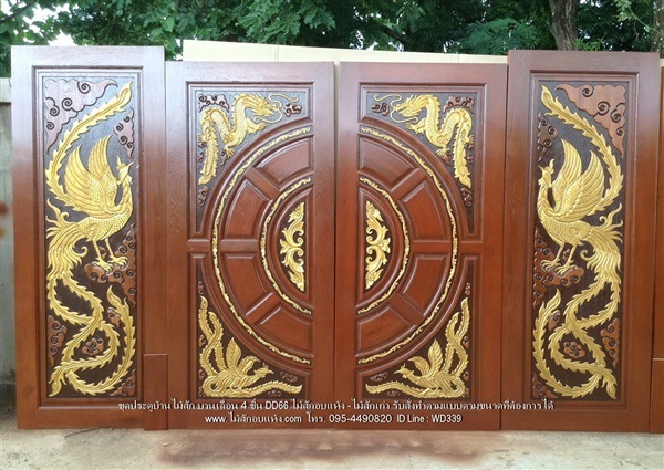 ชุดประตูบ้านไม้สัก บานเลื่อน 4 ชิ้น DD66 เเกะลายมังกรหงส์