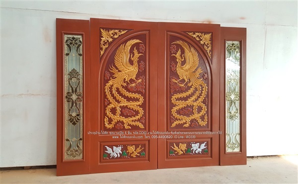 ชุดประตูบ้านไม้สักบานเปิด 4 ชิ้น รหัส DD60 แกะลายหงส์คู่+ปลา