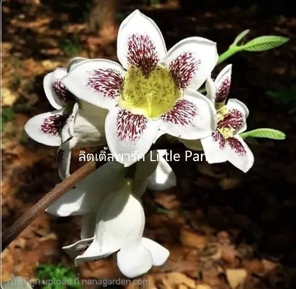 ดอก : ออกเป็นช่อกระจุกที่ซอกใบใกล้ปลายยอด ดอกสีขาวนวลด้านในมีตจุดประสีม่วง มีกลิ่นหอมอ่อนๆ