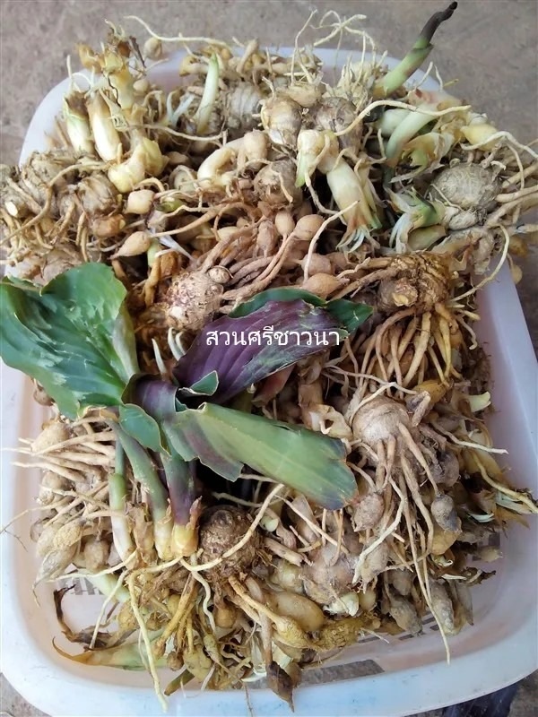 ดอก : ออกเป็นช่อจากเหง้า ใบประดับรูปไข่เรียวแหลม สีเขียวอ่อน ดอกสีขาวแต้มสีม่วง และมีกลิ่นอ่อน ๆ ในช่วงเช้า