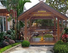 ศาลาไม้สักสีด้านคา5ขาวเชิงLทรงอโยธยา ( รหัส A5 ) ขนาด2x2x3ม.