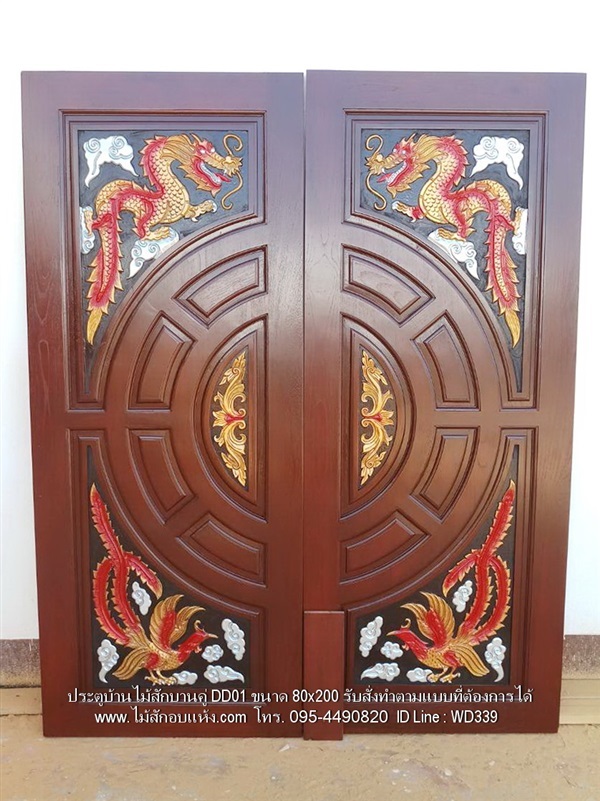 ประตูไม้สักบานคู่ DD01 เเกะสลักลายมังกรหงส์ ขนาด 80x200