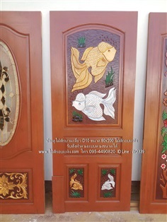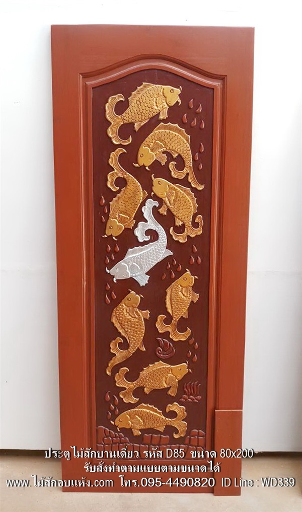 ประตูไม้สักบานเดี่ยว รหัส D85 แกะลายปลาเงิน-ปลาทอง 9ตัว