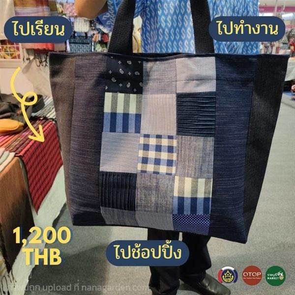 กระเป๋าทำจากผ้าไหมไทย ที่มีสีสันสวยสดใส นำมาประกอบ ประติดประต่อแบบปราณีตให้กลายเป็นกระเป๋าแบบแฟชั่น สามารถสะพายไหล่ได้หรือจะเดินถือหิ้วแบบเกร๋ๆ ก็ดูมีราศี