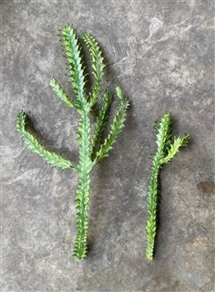 เป็นยูโฟเบีย มีลักษณะเป็น3 แฉก ลวดลายด่างตลอดแนวลำต้น มีหนามแข็งสั้นๆ ตลอดแนวสัน ปลูกเป็นไม้ประดับ ลงดินจะแตกกอเป็นทรงพุ่มสวยงาม