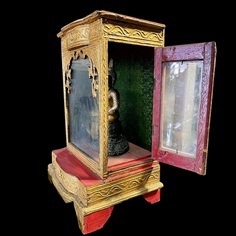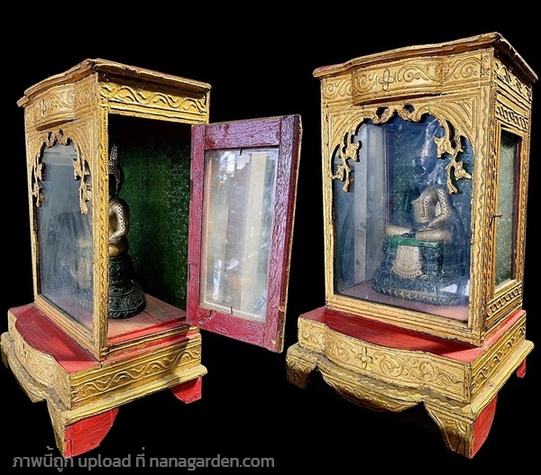 เปิดให้รับไปสะสม #ตู้กระจกใส่พระบูชา ปิดทอง ตู้กระจกแบบล้านนาโบราณสำหรับใส่พระบูชา ด้านหลังติดกระจกสีเขียวมรกต