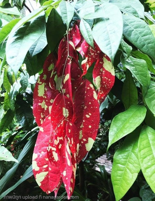 ไม้ที่ใบอ่อนเป็นลายแดงสลับเขียว พอใบเริ่มแก่ก็เปลี่ยนเป็นสีเขียวปกติ ถ้าแตกใบอ่อนมาใหม่ ก็มีลายอีกค่ะ วนเวียนให้ดูแบบนี้เป็นช่วงๆทั้งปี