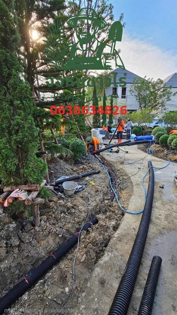 งานดูแลรายเดือน/รายปี, งานปลูกหญ้า, ระบบรดน้ำอัตโนมัติ, บ่อปลา, ไฟแต่งสวน