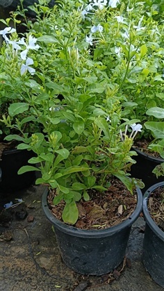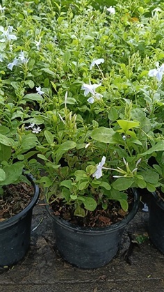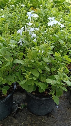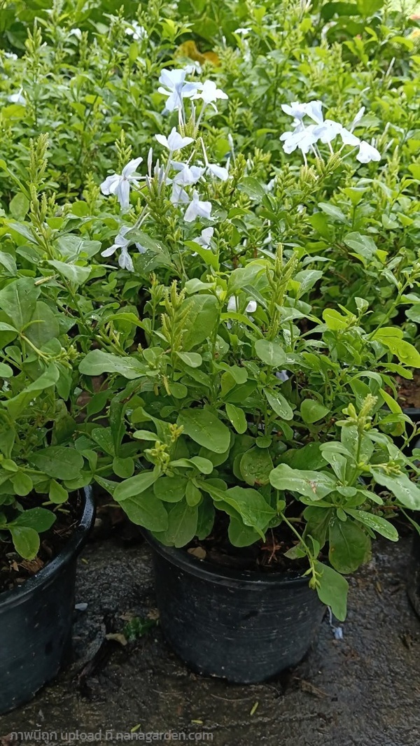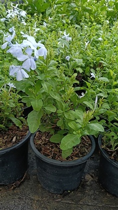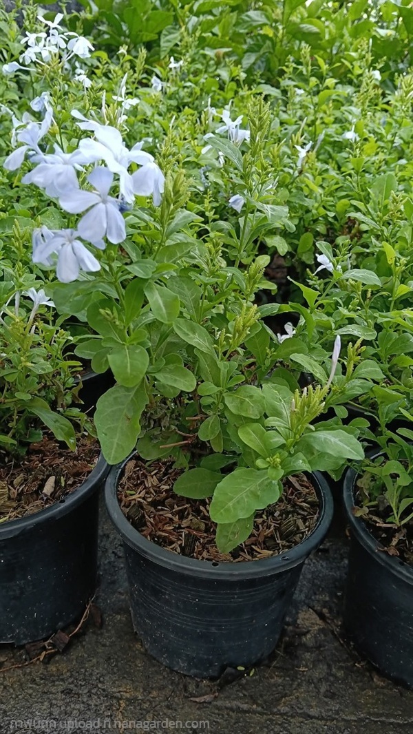 พยับหมอกขาวอมฟ้า เจตมูลเพลิงฝรั่งขาวอมฟ้า กำเนิดในแอฟริกาใต้ เป็นไม้พุ่มขนาดเล็ก ดอกสีขาวปนฟ้าอมเทา เลี้ยงง่าย ต้นสวยและแข็งแรง กระถาง 6 นิ้ว