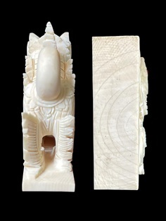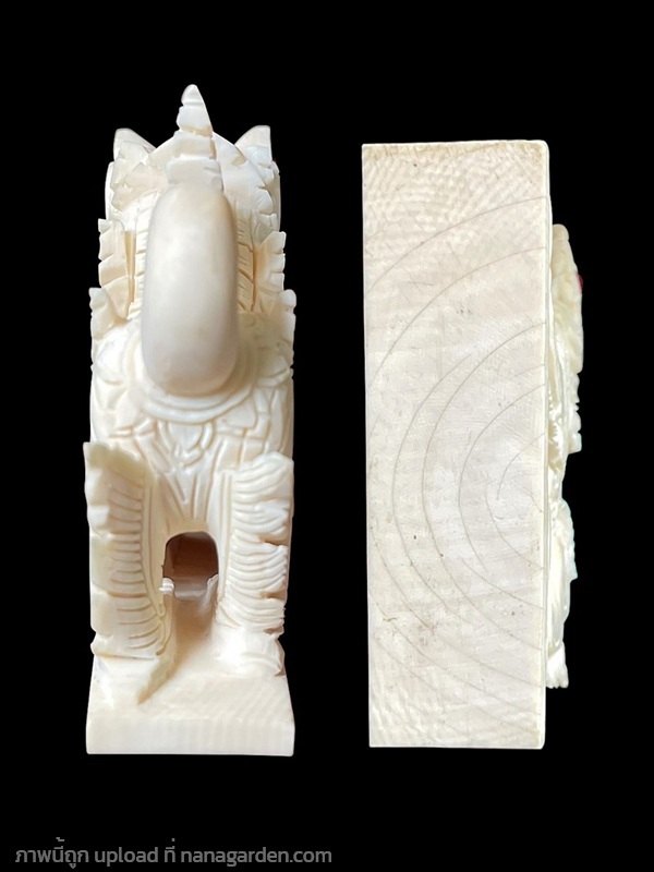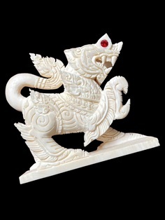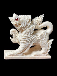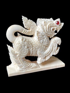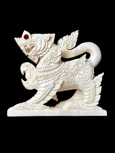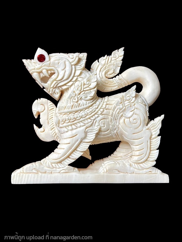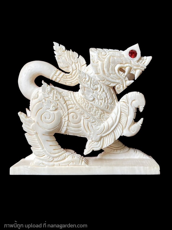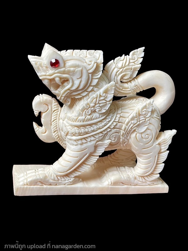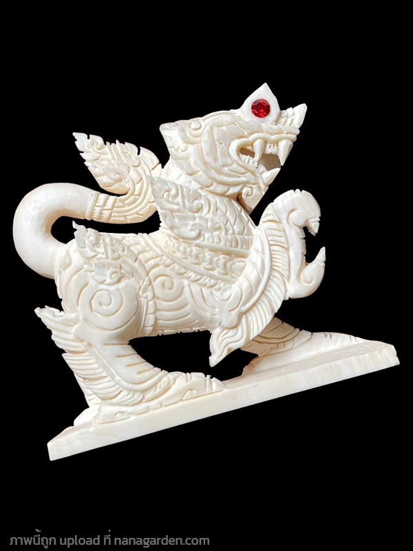 สิงห์มหาดไทย ทรงเครื่อง ตาพลอย แกะสลัก ลายกนก ชิ้นใหญ่หนา หายากสุดๆ ใต้ฐานขึ้นลายขดเป็นธรรมชาติ สีขาว ลายศิลป์มีความประณีต อ่อนช้อยสวยงาม