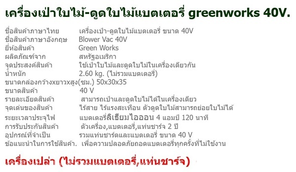 "มอเตอร์ไร้แปลงถ่าน"เครื่องเป่า,ดูดใบไม้แบตเตอรี่ ขนาด 40V (พร้อมชุดท่อดูดและถุงเก็บ 45 ลิตร) ความเร็วลมสูงสุด 370 กม./ชม.ใช้งานต่อเนื่องได้ 25-50 นาที. ระยะเวลาประจุไฟแบตเตอรี่ 4 แอมป์ 120 นาที. น้ำหนักเครื่องเครื่องเปล่า 2.9 กก./น้ำหนักรวมแบตเตอรี่ 4.2 กก. (ราคาไม่รวมแบตเตอร์รี่)