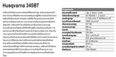 Husvarna รุ่น345BT เครื่องยนต์ ปริมาตรกระบอกสูบ 51.7 ซม กำลังเพลาส่งกำลัง 1.6 กิโลวัตต์ ปริมาตรถังเชื้อเพลิง 1.26 ลิตร อัตราสิ้นเปลืองเชื้อเพลิง 466 กรัม/กิโลวัตต์ชั่วโมง ความเร็วรอบสูงสุด 7,000 รอบต่อนาที อัตราการไหลของอากาศในท่อ 12.8 ม/นาที แรงเป่าลม 22 นิวตัน ความเร็วลม 78.2 ม./วินาที น้ำหนัก 9.96 กก.