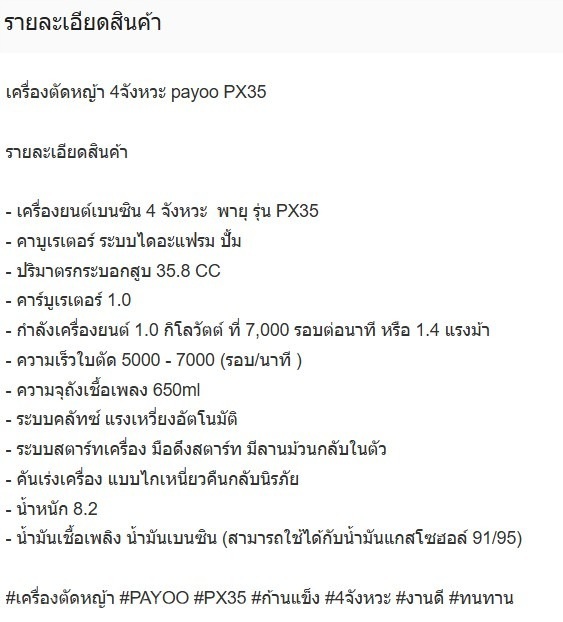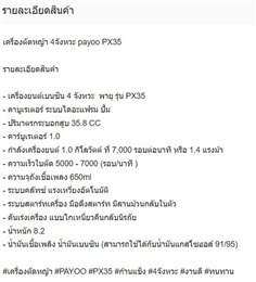 เครื่องตัดหญ้า 4จังหวะ payoo PX35 รายละเอียดสินค้า - เครื่องยนต์เบนซิน 4 จังหวะ พายุ รุ่น PX35 - คาบูเรเตอร์ ระบบไดอะแฟรม ปั้ม - ปริมาตรกระบอกสูบ 35.8 CC - คาร์บูเรเตอร์ 1.0 - กำลังเครื่องยนต์ 1.0 กิโลวัตต์ ที่ 7,000 รอบต่อนาที หรือ 1.4 แรงม้า - ความเร็วใบตัด 5000 - 7000 (รอบ/นาที ) - ความจุถังเชื้อเพลง 650ml - ระบบคลัทซ์ แรงเหวี่ยงอัตโนมัติ - ระบบสตาร์ทเครื่อง มือดึงสตาร์ท มีลานม้วนกลับในตัว - คันเร่งเครื่อง แบบไกเหนี่ยวคืนกลับนิรภัย - น้ำหนัก 8.2 - น้ำมันเชื้อเพลิง น้ำมันเบนซิน (สามารถใช้ได้กับน้ำมันแกสโซฮอล์ 91/95)