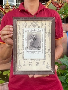 สภาพสวยสมบูรณ์ ปีพ.ศ. 2511 รับประกันแท้ หน้า-หลัง จารมหายันต์ครู (ขอมโบราณ) พุทธาภิเษกเดี่ยวและจารยันต์เองโดยหลวงพ่อแดง จัดสร้าง90บาน จำนวนตามอายุหลวงพ่อแดง ขนาด 20x29ซม. รวมกรอบ