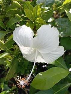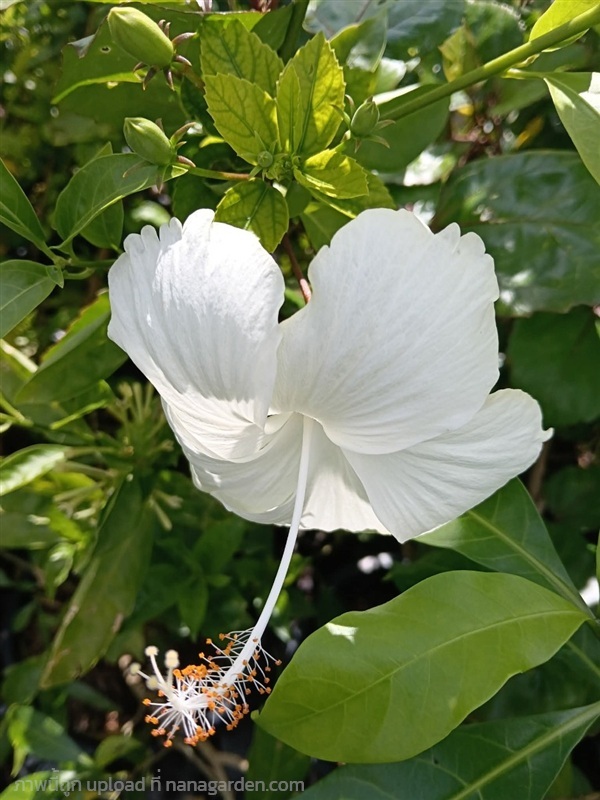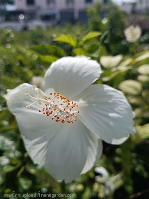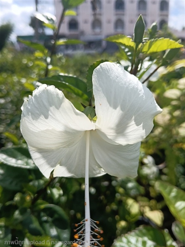 ชบาหนูสีขาว ไม้พุ่ม โตเต็มที่สูงได้ 2.00-3.00 เมตร แตกกิ่งก้านเป็นพุ่มแน่น ใบเดี่ยว ออกสลับรูปไข่กว้าง ปลายเรียวแหลม โคนสอบหรือมน ขอบใบจัก ออกดอกเป็นดอกเดี่ยว กระถาง 11 นิ้ว ต้นสวย