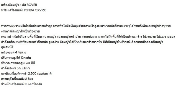 รถเข็นตัดหญ้า 4 ล้อ เครื่องยนต์ HONDA GXV160 โครงเหล็กยี่ห้อ ROVER รุ่นH1HA333 เครื่องยนต์ 5.5 แรงม้า สตารท์ติดง่าย ประหยัดน้ำมัน โดยตัวเครื่องตัดหญ้าวัสดุเกรดดี ทนทาน ดีไซน์สวย สามารถปรับระดับความสูงได้ถึง 10 ระดับ อีกทั้งมาพร้อมกับถังเก็บหญ้าที่มีขนาดใหญ่ไม่ต้องเสียเวลาเก็บหญ้าหลังตัดเสร็จ