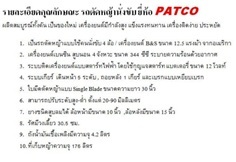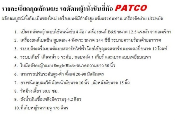 รถตัดหญ้านั่งขับ ยี่ห้อ PATCO เครื่องยนต์ B&S ขนาด 12.5 แรงม้า ระบบเกียร์ เดินหน้า 5 ระดับ ถอยหลัง 1 เกียร์ ใบมีดตัดหญ้าแบบ Single Blade ขนาดความยาว 30 นิ้ว