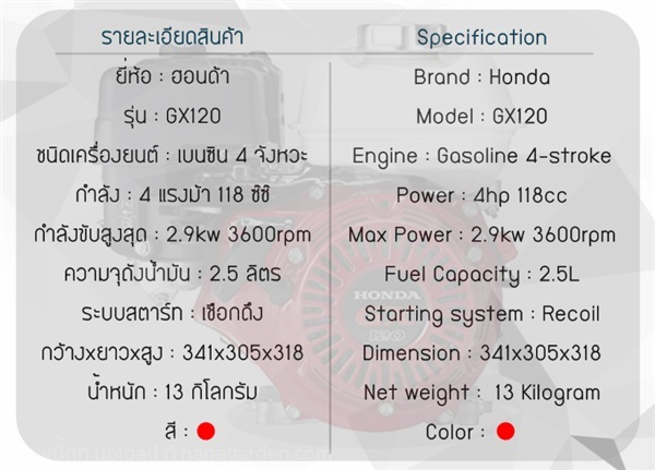 กำลังสุทธิ : 3.5 แรงม้า ที่ 3600 รอบ/นาที