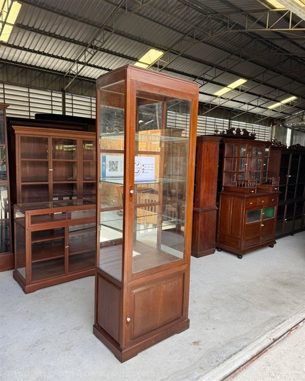 ตู้โชว์หน้าร้านงานเก่าอายุเกิน 50 ปี ด้านในบุด้วยกระจกเงาให้ความสว่างและมิติ ชั้นวางเป็นกระจกใส เหมาะสำหรับโชว์ของสะสมหรือสินค้าที่ต้องการความโดดเด่น ฟอร์มสูงเพรียวทำให้วางได้แม้ในพื้นที่จำกัดและยังดูโปร่งสวย เป็นไม้สักทั้งหลัง