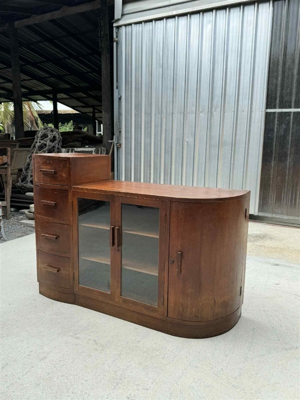 ตู้ไซด์บอร์ดลิ้นชักหน้าโค้ง งานชิ้นนี้มีดีไซน์โดดเด่นด้วยลักษณะโค้งมน ทั้งด้านหน้าและด้านข้าง ฝั่งซ้ายเป็นลิ้นชักสี่ชั้นเข้าหางเหยี่ยวแบบโบราณ ส่วนกลางเป็นบานเปิดกระจกคู่ เหมาะสำหรับโชว์ของสะสมหรือของใช้ภายในบ้าน ด้านขวาเป็นบานโค้งเปิดออก ภายในมีชั้นวางสามชั้น ใช้งานได้หลากหลาย ฟอร์มสวยสมบูรณ์ ผลิตจากไม้สักทั้งหลัง งานยุคพระนคร หลังเข้ากรอบลูกฟักดั้งเดิม อายุเกิน 60 ปี แข็งแรงทนทานและทรงคุณค่าในการสะสม