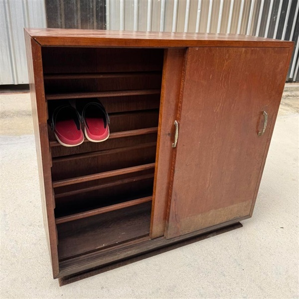 ตู้ใส่รองเท้าขาแชมเปญ งานเก่า ทำจากไม้สักทั้งหลัง แข็งแรงทนทาน ใช้งานได้จริง ด้านในเป็นชั้นวางเอียงสี่ชั้น พร้อมพื้นที่ด้านล่างสำหรับวางรองเท้าเพิ่มเติม รวมแล้วสามารถเก็บรองเท้าได้ประมาณ 30 คู่ รองรับทุกไซด์ เหมาะสำหรับบ้านหรือร้านที่ต้องการความเป็นระเบียบ ตัวตู้ยังคงสีเดิม มีร่องรอยน้ำท่วมเล็กน้อยที่ขอบด้านล่าง ไม่กระทบต่อการใช้งาน อายุเกิน 60 ปี