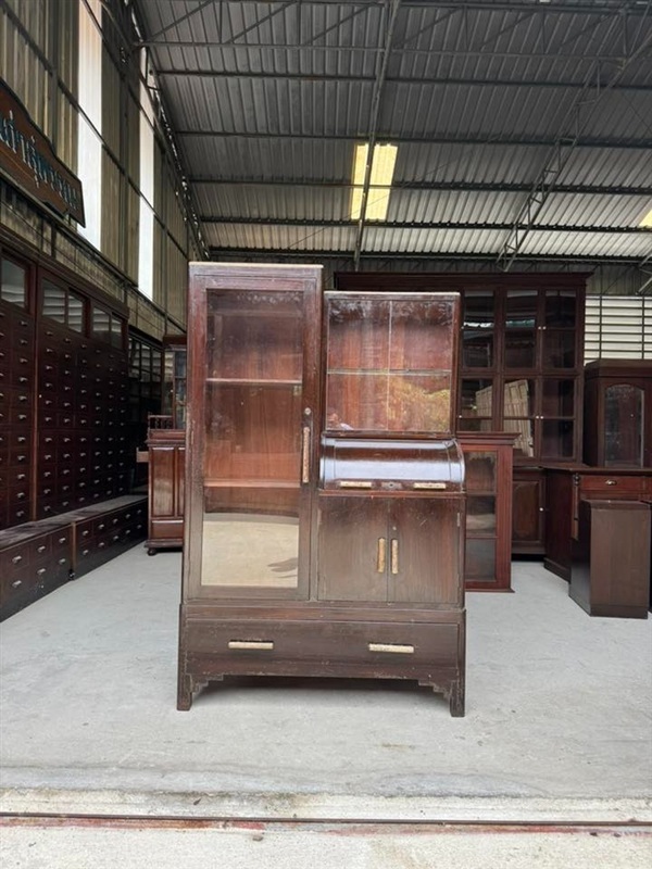 ตู้โชว์ฟอร์มพิเศษอายุเกิน 60 ปี งานเก่าหายาก เป็นไม้สักทั้งหลัง สีเดิม ฟอร์มใหญ่ครบฟังก์ชัน ด้านซ้ายเป็นบานเปิด ภายในมีชั้นวางสามชั้น ด้านขวาด้านบนเป็นบานเลื่อนกระจกพร้อมชั้นกระจกสำหรับวางของสองชั้น ถัดลงมาเป็นบานเปิดแบบเปลี่ยนมือ เปิดขึ้นและสามารถชักพื้นออกมาใช้เป็นโต๊ะเขียนได้ ด้านล่างเป็นบานเปิดคู่ ภายในโล่งสำหรับเก็บของ และล่างสุดมีลิ้นชักใหญ่เพิ่มพื้นที่จัดเก็บ เหมาะสำหรับใช้จัดวางหรือสะสม