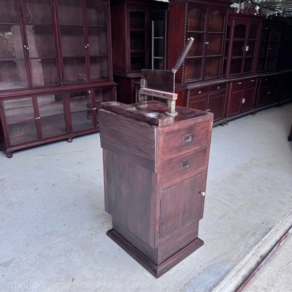 เคาน์เตอร์หั่นยาโบราณฟอร์มใหญ่สำหรับการยืนใช้งาน หายากมากไม่ค่อยพบเจอ ตัวเคาน์เตอร์ทำจากไม้สัก อายุเกิน 60 ปี ด้านข้างมีช่องสำหรับเสียบมีด ด้านบนทำท็อปพร้อมช่องวางของหรืออุปกรณ์ 3 ช่อง เหมาะสำหรับจัดวางโหลยาโบราณหรือของสะสม ด้านหลังประกอบด้วยลิ้นชัก 2 ช่องและบานเปิด 1 ช่อง ขาเป็นทรงแชมเปญ แข็งแรงและได้อารมณ์งานร้านยาเก่าแบบดั้งเดิม