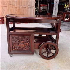 รถเข็นไม้สักแกะลายช้างงานไม้สักทั้งตัว หน้าโต๊ะพับได้