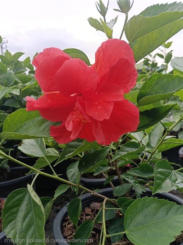 ชบาดอกซ้อนแดง ไม้พุ่ม โตเต็มที่สูงได้ 2.00-3.00 เมตร แตกกิ่งก้านเป็นพุ่มแน่น ใบเดี่ยว ออกดอกซ้อน ตามซอกใบใกล้ปลายยอด ดอกสีแดงสวยงาม กระถาง 11 นิ้ว ต้นสวย