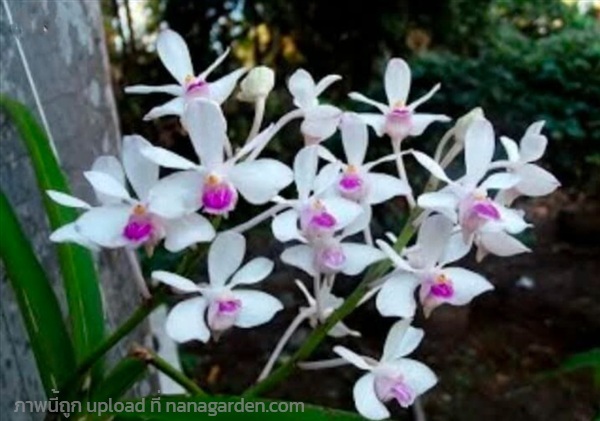 ดอก: ดอกออกเป็นช่อที่ด้านข้าง จำนวน 10 – 15 ดอก สีขาว บานเต็มที่กว้าง 1.5 เซนติเมตร กลีบปากอาจมีสีม่วงอ่อน ออกดอกเดือนมีนาคม – พฤษภาคม
