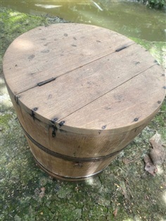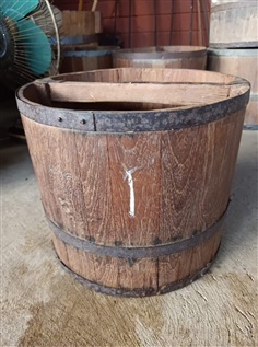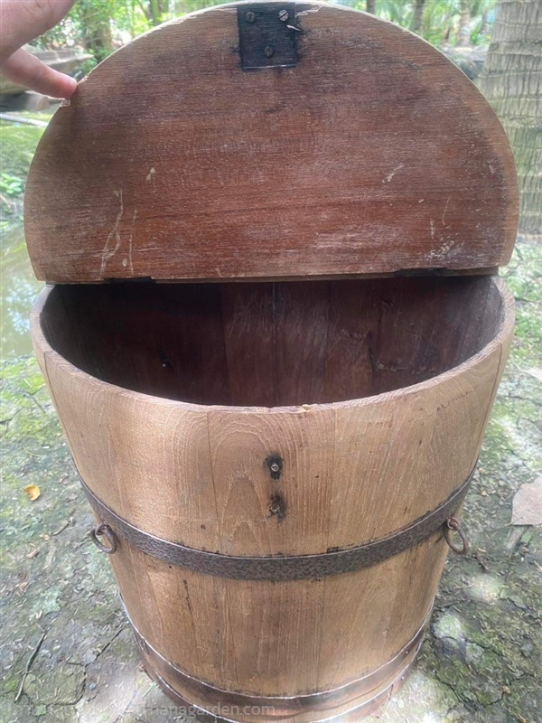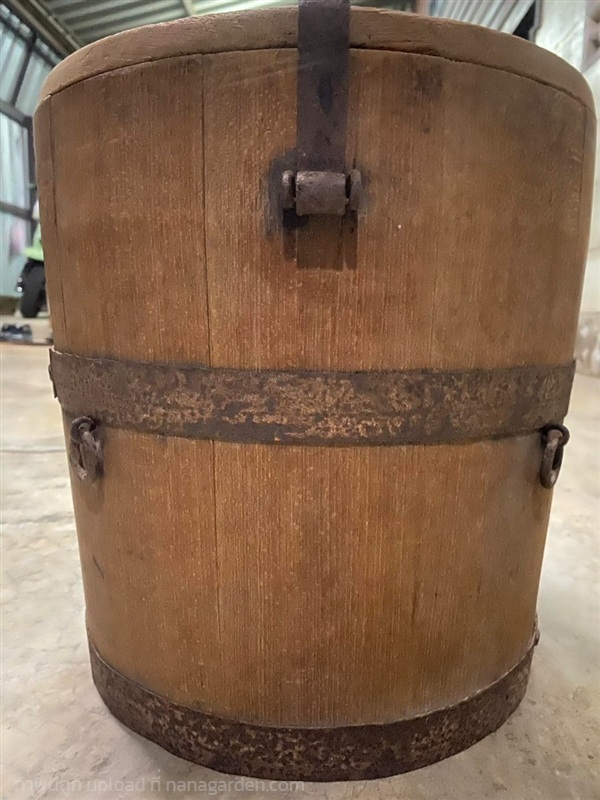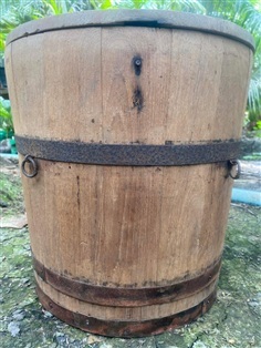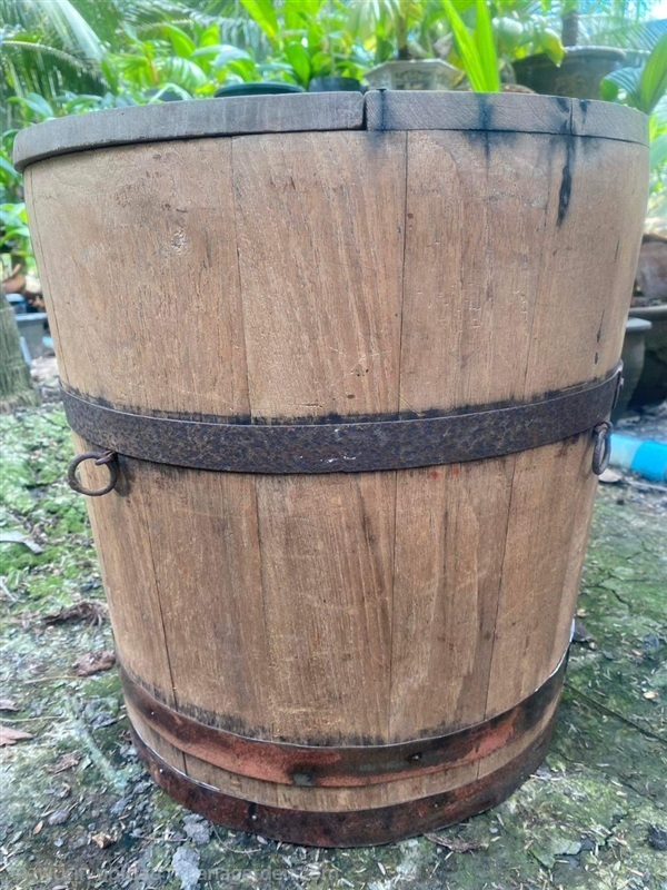 ถังไม้โบราณ ภาชนะทรงกระบอก ก้นทึบ ขนาดบรรจุ30ลิตร ทำด้วยไม้สัก มีแผ่นโลหะรัดที่บริเวณรอบนอกของถังเพื่อเสริมความแข็งแรง พร้อมฝาปิด สภาพเก่าเดิม ศิลปะจากชาวจีนแผ่นดินใหญ่