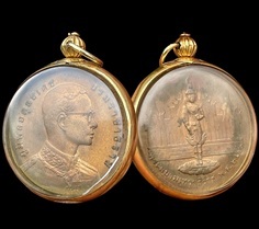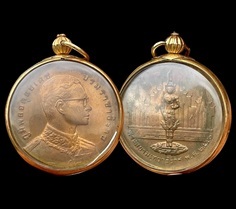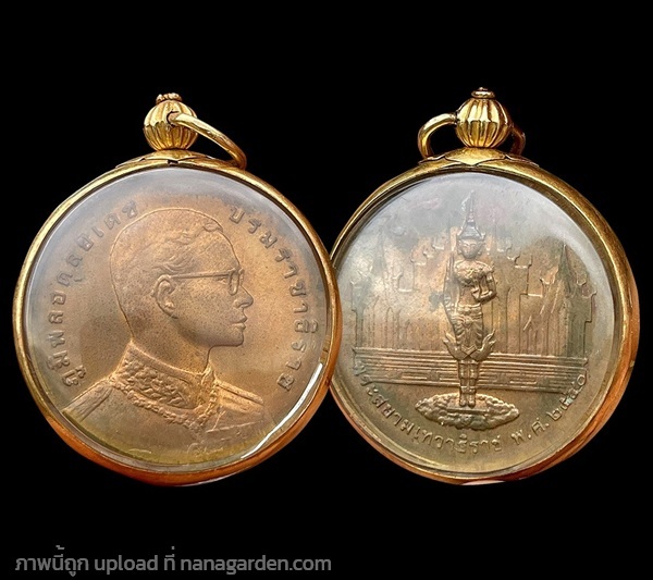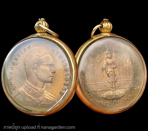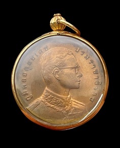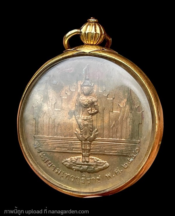 พระเจ้าอยู่หัวภูมิพลอดุลยเดช บรมราชาธิราช หลัง พระสยามเทวาธิราช ผลิตปี2540 ทองแดง สภาพสวยสมบูรณ์ ขนาด3ซม จัดสร้างจำนวน 1,999 ชิ้น หายาก