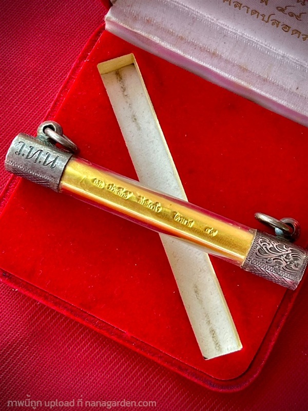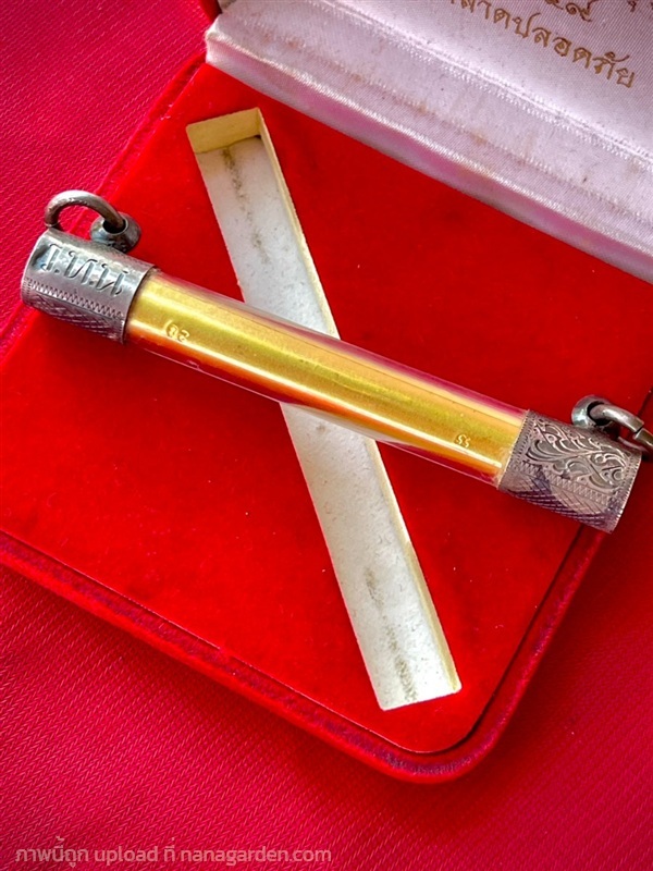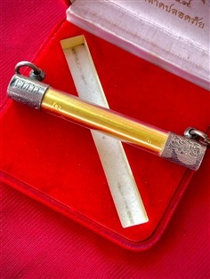 ภายในตะกรุดอุดด้วยผงพุทธคุณและเกศาหลวงพ่อ (ตะกรุดตอกโค๊ดหมายเลข49 และชื่อหลวงพ่อ)