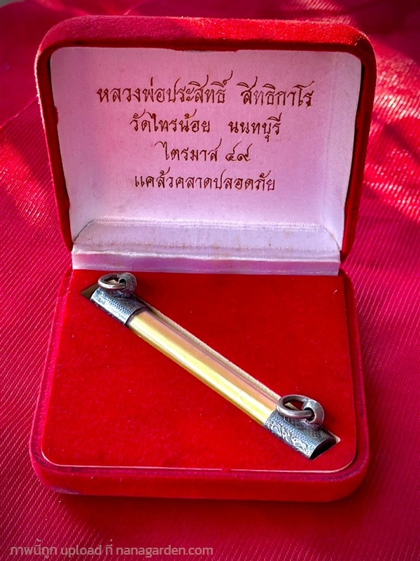 สภาพสวยสมบูรณ์ เก็บอยู่ในกรอบฝาและห่วงห้อยเนื้อเงินแท้ ตราปั๊มวัด ว.ท.น พร้อมกล่องเดิมออกจากวัด ด้านหน้ากล่องมีเหรียญหลวงพ่อประสิทธิ์ติดไว้ เลขโค๊ต28 (คาดว่าเป็นเหรียญเงินกะไหร่ทอง)