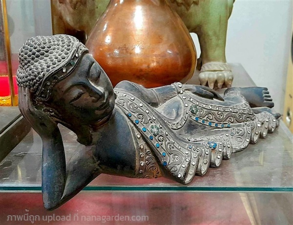 พระพุทธรูปไม้ศิลปะพม่า - พุกาม (ล้านนา) อัญมณีเม็ดงามแห่งลุ่มน้ำอิระวดี พระไม้โบราณ พระนอน สมัยมัณฑะเลย์ งานฝีมือสกุลช่างชาวล้านนายุคเก่า ลงรักแต่งองค์ สีดำลงรัก เป็นปางที่สร้างเพื่อระลึกถึงการปรินิพพานของพระพุทธเจ้า และเป็นพระประจำของผู้ที่เกิดวันอังคาร