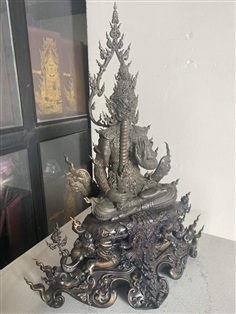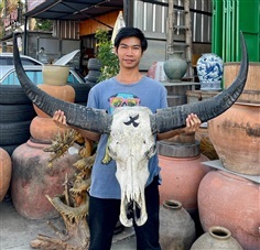 ลักษณะเป็นเขาโค้งวนปลายแหลม ติดหัวไม้แกะสลัก หัวใหญ่ เก็บสะสมมานานหลายปี สำหรับแขวนผนัง ประดับบารมี ติดโชว์ สร้างบรรยากาศ ตกแต่งร้าน