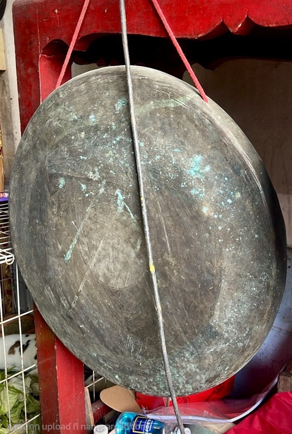 เปิดสะสม ฆ้องโบราณ เนื้อสำริด ใบใหญ่ แบบไม่มีปุ่ม หน้าเรียบ ขนาดกว้าง22นิ้ว สภาพสวยสมบูรณ์ อายุยาวนานกว่า50ปี งานเก่าเก็บสะสม บางพื้นที่จะเรียกว่า “ลูกโหม่ง”