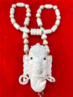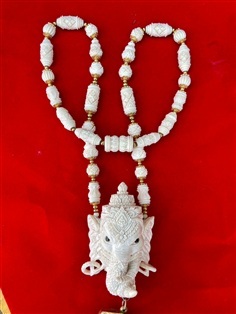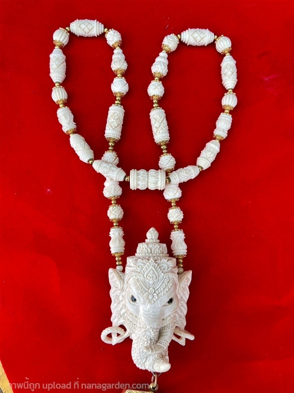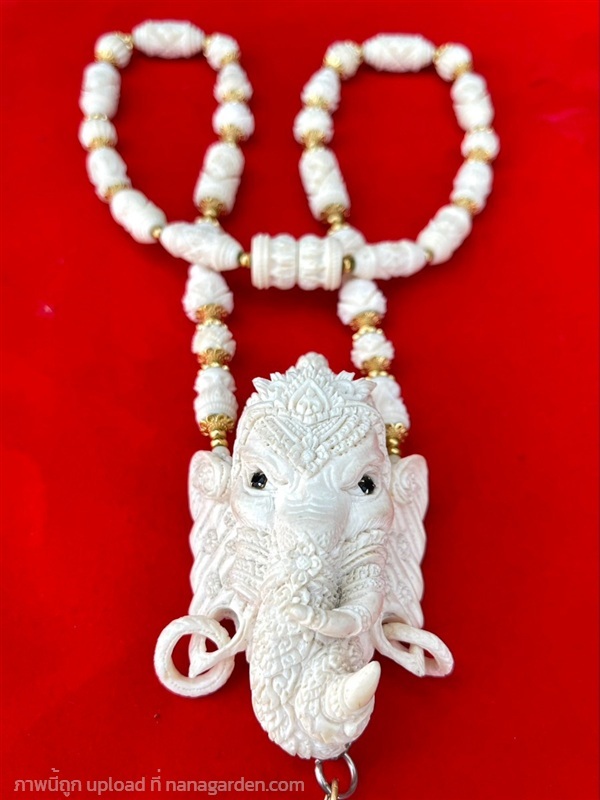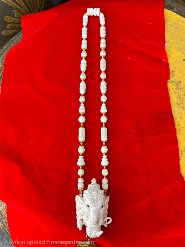 สร้อยงาช้างแกะสลัก ลายซุ้มกระนก งานวิจิตรศิลป์ สุดอลังการ ขนาดสวมใส่ ห้อยพระได้ งาแกะสลักทั้งเส้น ประดับคั่นด้วยลูกปัดชุปทองคำ สภาพสวยสมบูรณ์ โดยมีเม็ดปะคำงาแกะสลักหลายรูปแบบในเส้นเดียว มีทั้งทรงน้ำเต้า ทรงมะยม ทรงกรวย และทรงกระบอก โดยเฉพาะหัวสร้อยงา เป็นปลายงาตันชิ้นใหญ่ แกะสลักรูปเศียรพระพิฆเนศ (เอราวัณ) ติดพลอยสีดำ มีตุ้มหูห้อยในตัวแบบอิสระ