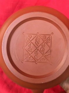 กาชงน้ำชาดินเผา (ปั้นชา) ต้นดำเนิดจากเมืองอี๋ซิง Yixing มณฑลเจียงซู ประเทศจีน กาน้ำชาเก่าสะสม สีส้มดินแดง ทรงกลมมนคล้ายลูกส้มโอ ไม่เคลือบผิว ขนาดใหญ่ หูจับทองเหลือง เป็นงานละเอียด ปราณีต ซึ่งต้องใช้ระยะเวลาและฝีมือ ใต้ฐานตีปั๊มตราจีน บ่งบอกถึงผู้จัดสร้าง