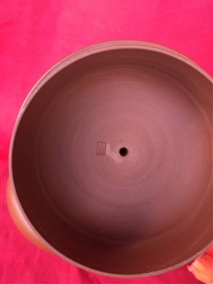 กาชงน้ำชาดินเผา (ปั้นชา) ต้นดำเนิดจากเมืองอี๋ซิง Yixing มณฑลเจียงซู ประเทศจีน กาน้ำชาเก่าสะสม สีส้มดินแดง ทรงกลมมนคล้ายลูกส้มโอ ไม่เคลือบผิว ขนาดใหญ่ หูจับทองเหลือง เป็นงานละเอียด ปราณีต ซึ่งต้องใช้ระยะเวลาและฝีมือ ใต้ฐานตีปั๊มตราจีน บ่งบอกถึงผู้จัดสร้าง