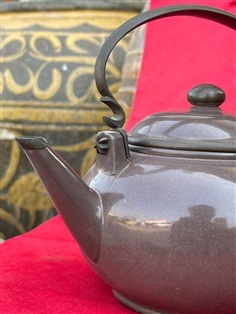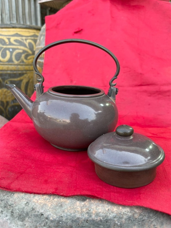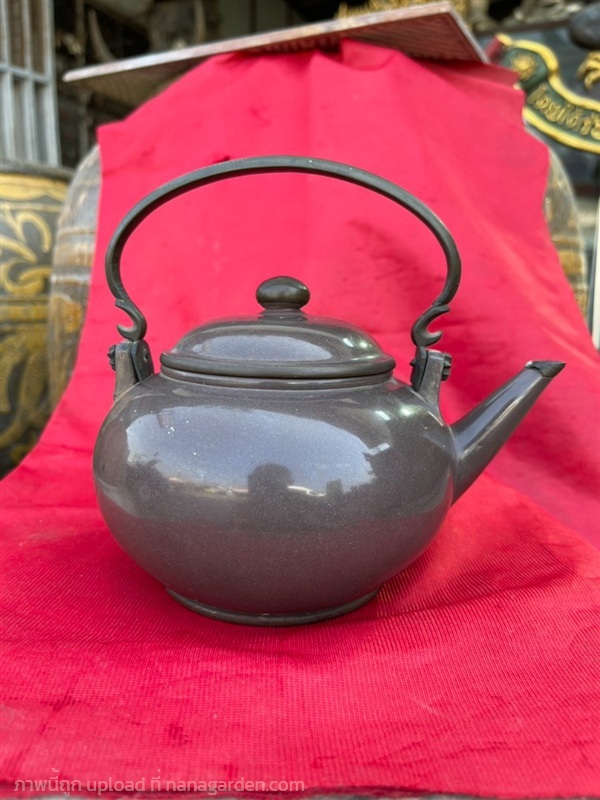 กาน้ำชาดินเผา (ปั้นชา) ต้นดำเนิดจากเมืองอี๋ซิง Yixing มณฑลเจียงซู ประเทศจีน กาน้ำชาเก่าสะสม สีดินดำ ทรงกลมมนคล้ายลูกส้มโอ ผิวขัดเงา ขนาดใหญ่ หูจับทองเหลือง เป็นงานละเอียด ปราณีต ซึ่งต้องใช้ระยะเวลาและฝีมือ ใต้ฐานตีปั๊มตราจีน บ่งบอกถึงผู้จัดสร้าง