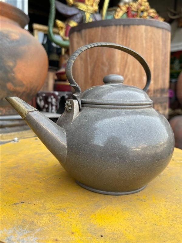 กาน้ำชาดินเผา (ปั้นชา) ต้นดำเนิดจากเมืองอี๋ซิง Yixing มณฑลเจียงซู ประเทศจีน กาน้ำชาเก่าสะสม สีดินดำ ทรงกลมมนคล้ายลูกส้มโอ ผิวขัดเงา ขนาดใหญ่ หูจับทองเหลือง เป็นงานละเอียด ปราณีต ซึ่งต้องใช้ระยะเวลาและฝีมือ ใต้ฐานตีปั๊มตราจีน บ่งบอกถึงผู้จัดสร้าง