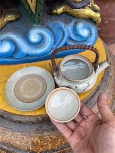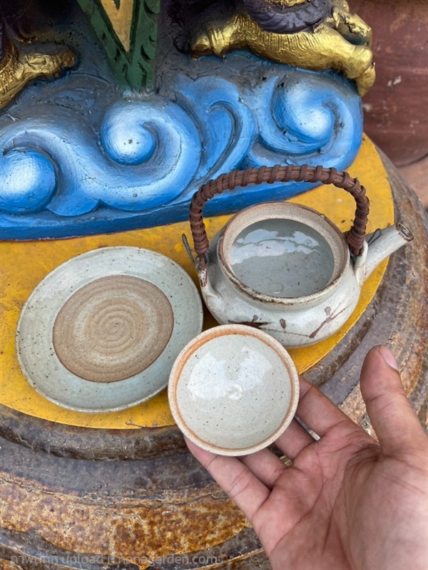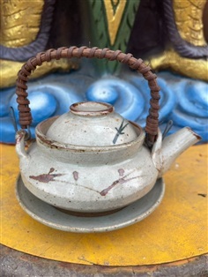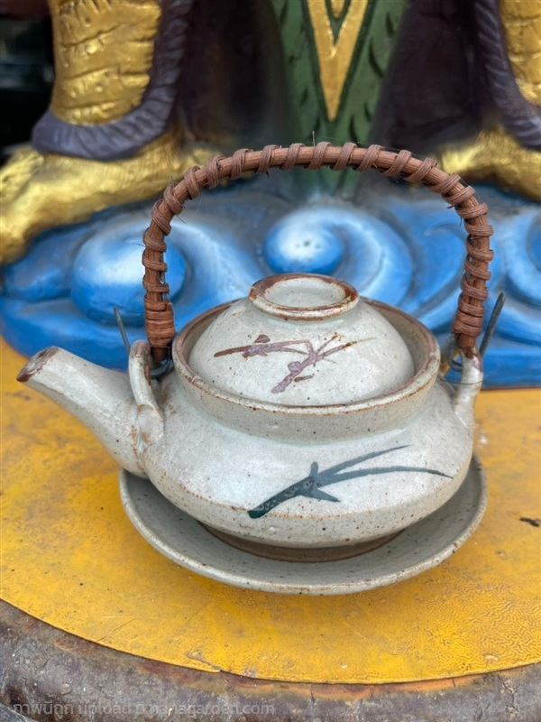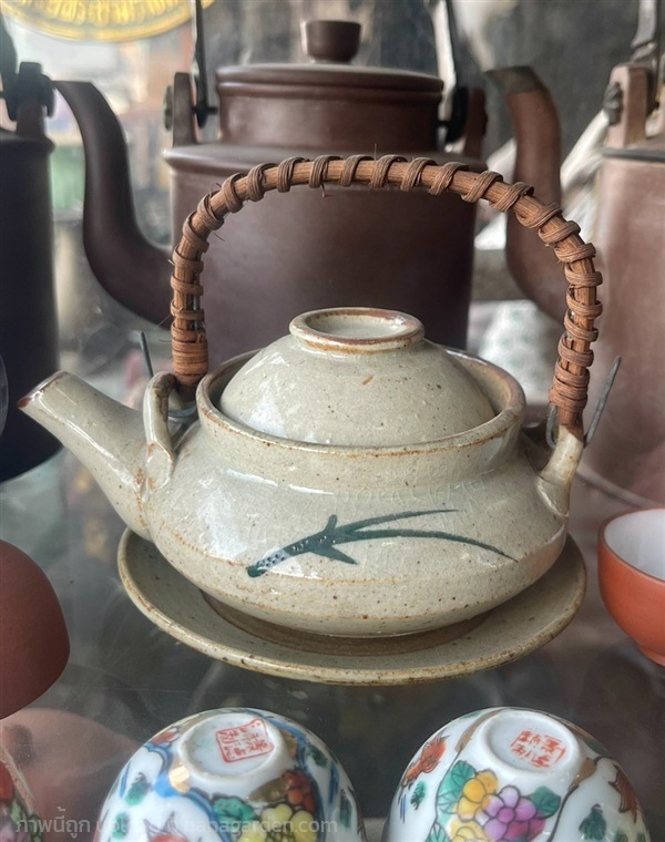 กาน้ำชาดินเผาน้ำเคลือบ ซึ่งเป็นงานฝีมือแบบดั้งเดิม ที่มีต้นกำเนิดมาตั้งแต่ศตวรรษที่ 15 ยาวนานกว่า600ปี ใบนี้ผลิตขึ้นราวปี 1955 (อายุกว่า70ปี) ทำจากดินสีขาวนวลจันทร์ น้ำเคลือบสีมันปี ลายดอกหญ้า