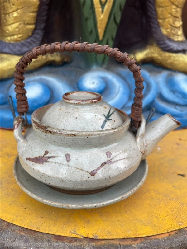 กาน้ำชาดินเผา (ปั้นชา) ใบนี้คาดว่าต้นกำเนิดจากประเทศญี่ปุ่น เป็นกาน้ำชาเก่าสะสม ทรงกลมเสี้ยนหยวน (ห่วงไม้) เคลือบผิวสีมันปู ขนาดกลาง เป็นงานละเอียด ปราณีต ซึ่งต้องใช้ระยะเวลาและฝีมือ