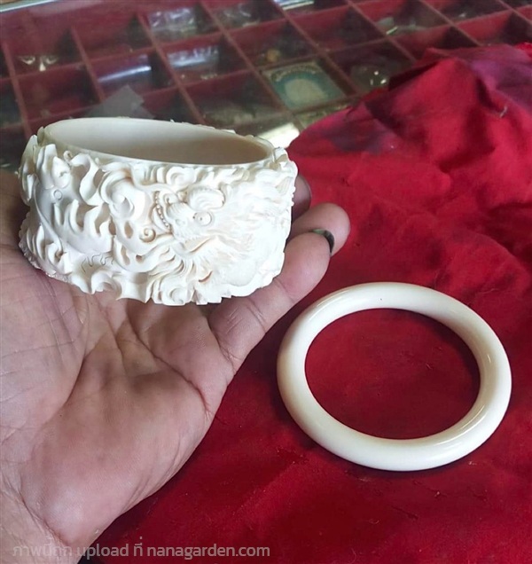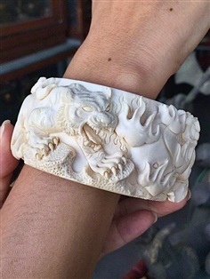 โคนงาแกะสลัก ชิ้นใหญ่ งานเก่าเก็บสะสม กำไลประเภทนี้นิยมสวมใส่โชว์ออกงาน สภาพสวยสมบูรณ์ แข็งแรง งานฝีมือปราณีต ละเอียดคมชัด มีเอกลักษณ์ไม่เหมือนใคร เป็นงานสั่งทำโดยช่างนครสวรรค์ นานๆถึงจะมีให้เห็น