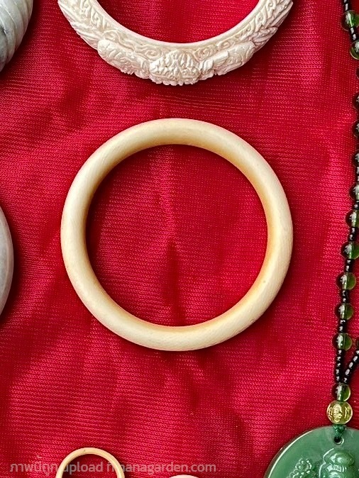 รูปทรงกลมมน ผิวเรียบ งานฝีมือแกะสลัก จากโคนงาชิ้นใหญ่ โคนงาแกะสลัก งานเก่าเก็บสะสม กำไลประเภทนี้นิยมสวมใส่โชว์ออกงาน สภาพสวยสมบูรณ์ แข็งแรง งานฝีมือปราณีต ละเอียด ลายเสี้ยนคมชัด มีเอกลักษณ์ไม่เหมือนวัสดุอื่นๆ เป็นงานสั่งทำโดยช่างนครสวรรค์ นานๆถึงจะมีให้เห็น