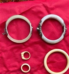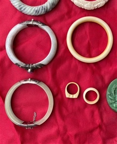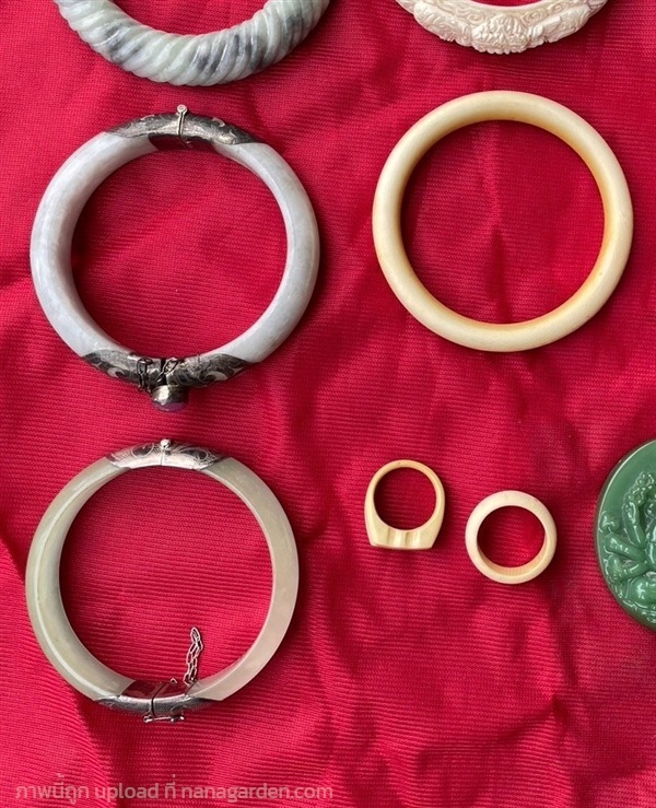 งานหินหยกเก่า ทำจากหยกเนื้ออ่อน (Nephrite) แกะขึ้นรูปวงกลมผ่าซักทำเป็นกำไล ลักษณะเป็นแก้วสีใสเขียวอ่อนมรกต มีความเย็นในตัวเมื่อสัมผัส เคาะแล้วจะมีเสียงใสกังวาล เอกลักษณ์ที่ไม่เหมือนใคร