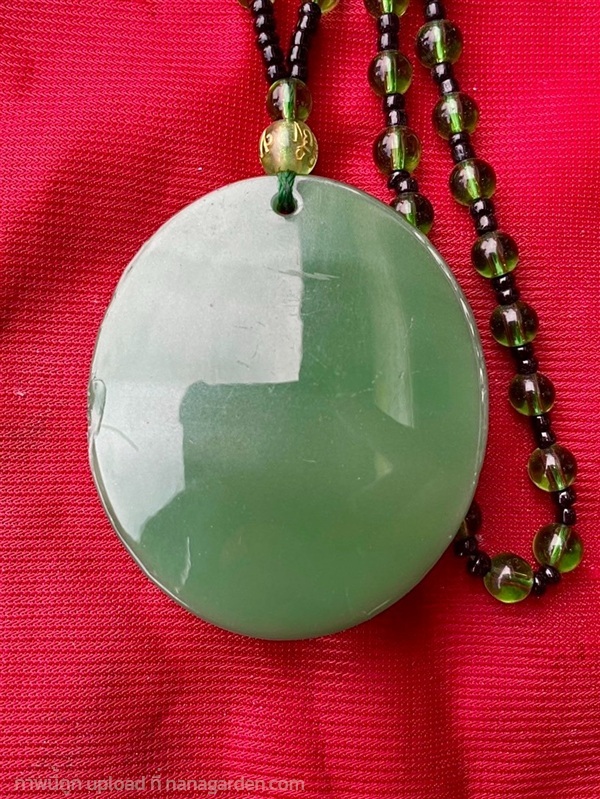 งานหินหยกเก่า ทำจากหยกเนื้ออ่อน (Nephrite) แกะขึ้นรูปวงกลม ด้านหน้าเป็นพระโพธิสัตว์กวนอิม ปางพันกร ลักษณะเป็นแก้วสีใสเขียวมรกต มีความเย็นในตัวเมื่อสัมผัส เคาะแล้วจะมีเสียงใสกังวาล เอกลักษณ์ที่ไม่เหมือนใคร สภาพแข็งแรง ใช้งานและโชว์ได้