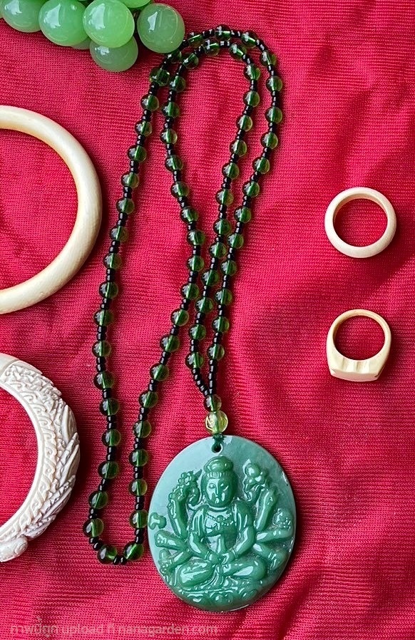 สร้อยคอ พร้อมจี้หยกแกะสลักรูปกวนอิม ปางพันกร หลังเรียบ สร้อยลูกปัดสีเขียวมรกต ควรค่าแก่การสะสม