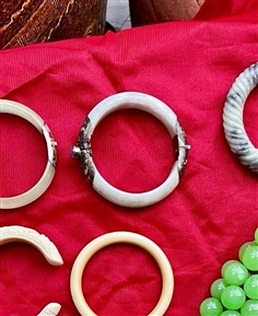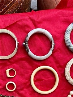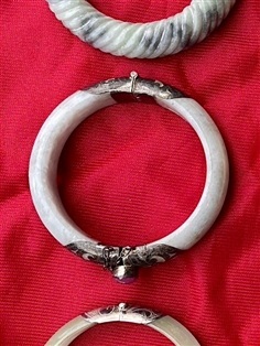 งานหินหยกเก่า ทำจากหยกเนื้ออ่อน (Nephrite) แกะขึ้นรูปวงกลมผ่าซีกทำเป็นกำไล ลักษณะเป็นแก้วสีใสขาวน้ำนม (ขาวมุก) มีความเย็นในตัวเมื่อสัมผัส เคาะแล้วจะมีเสียงใสกังวาล เอกลักษณ์ที่ไม่เหมือนใคร